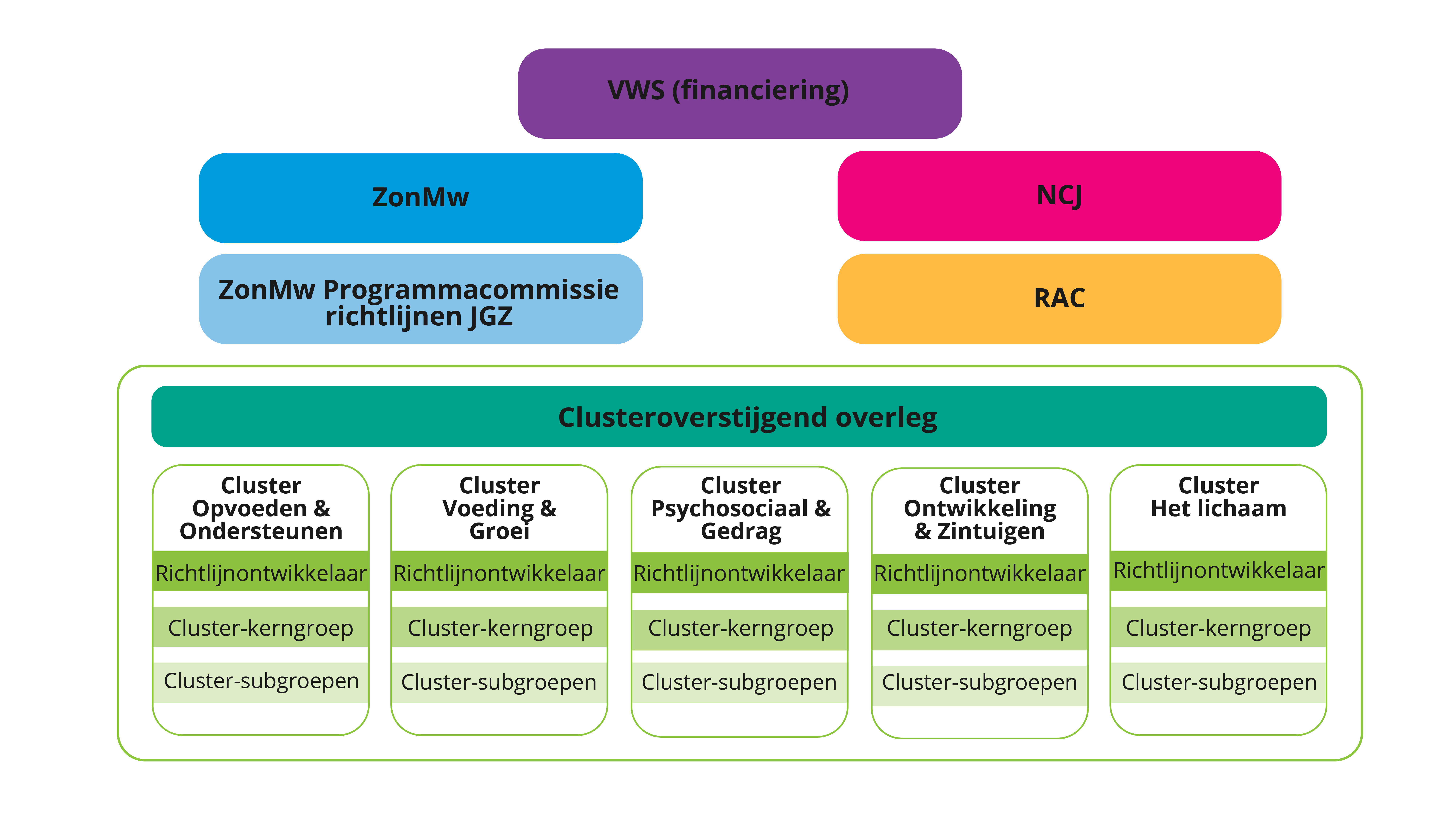 De Cluster-subgroepen bestaan minimaal voor de helft uit JGZ-professionals zodat de aanbevelingen goed aansluiten op de dagelijkse werkzaamheden.